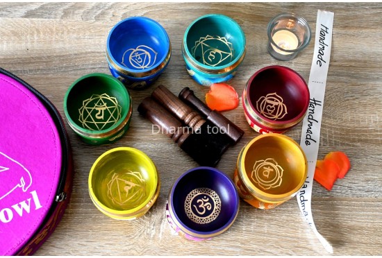 Dharma Tool proudly presents the 7 Chakra Color Healing Singing Bowl Set of 7, a complete sound-healing toolkit designed to align body, mind, and spirit. Each bowl is hand-forged in Nepal from the sacred seven-metal alloy—gold, silver, copper, iron, tin, lead, and zinc—and hand-painted in the seven chakra colors, each representing a vital energy center within the body.